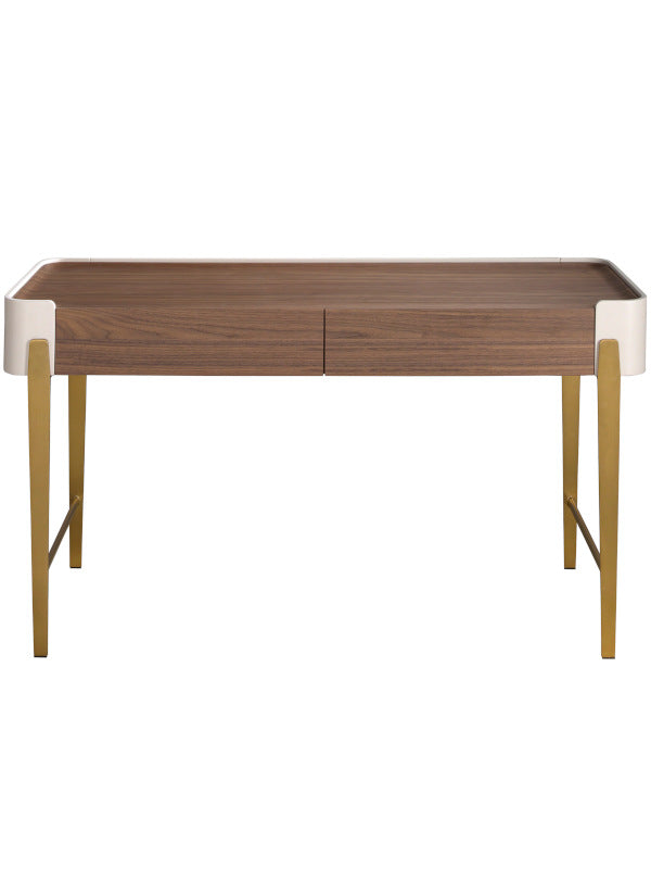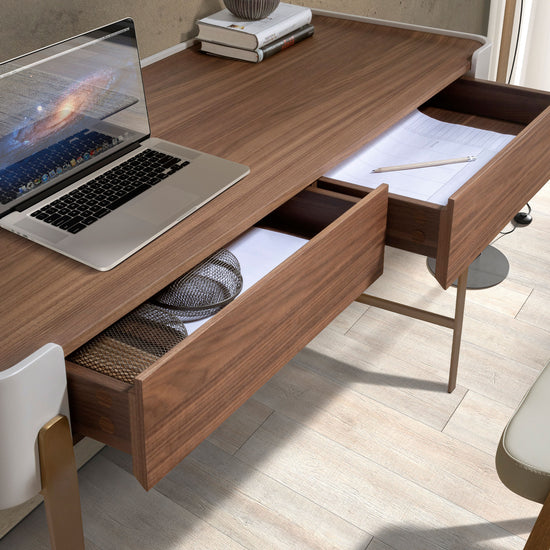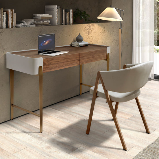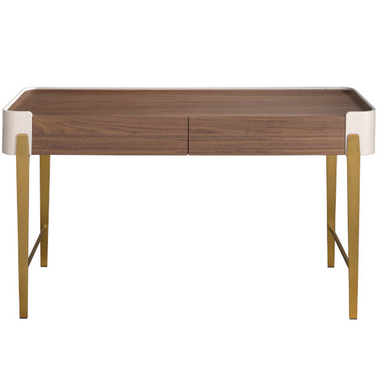 Alaska desk in walnut, beige and polished gold steel with a modern design, made of natural walnut veneered wood and beige lacquered MDF.