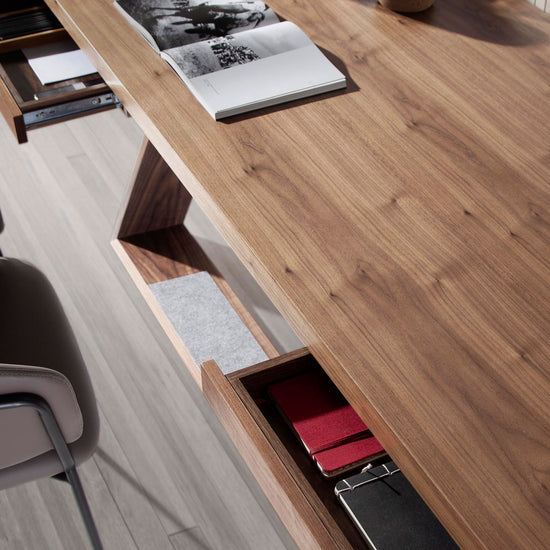 Illinois desk with a modern design in natural walnut veneer. The design of its natural walnut veneer legs will add a sophisticated and unique touch to your bedroom.