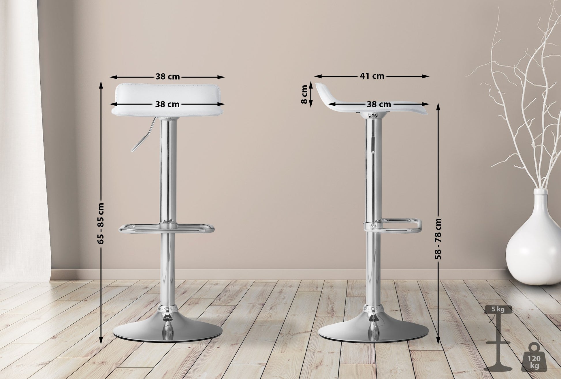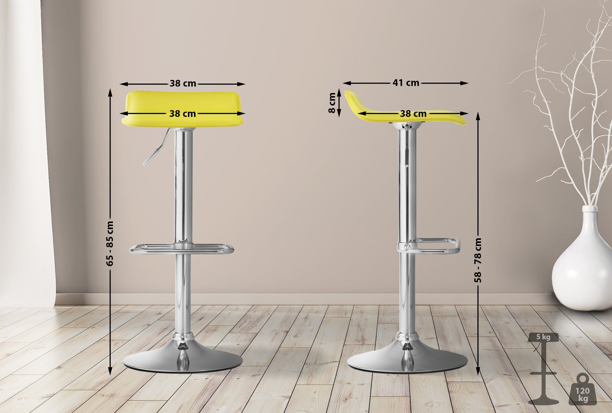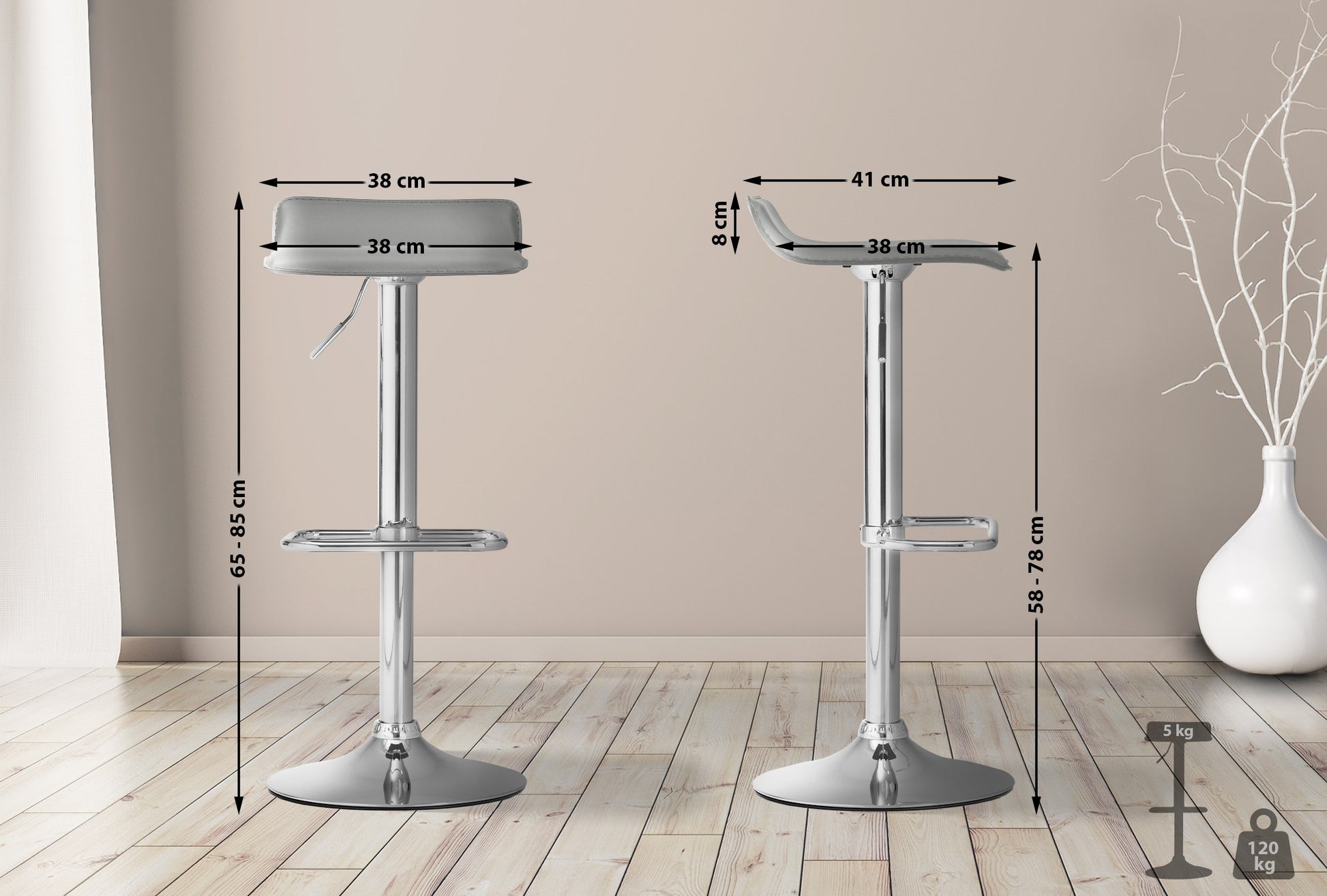 The bar stool features a height-adjustable seat that can be easily adjusted to your needs. The 360-degree rotation allows for unrestricted freedom of movement.