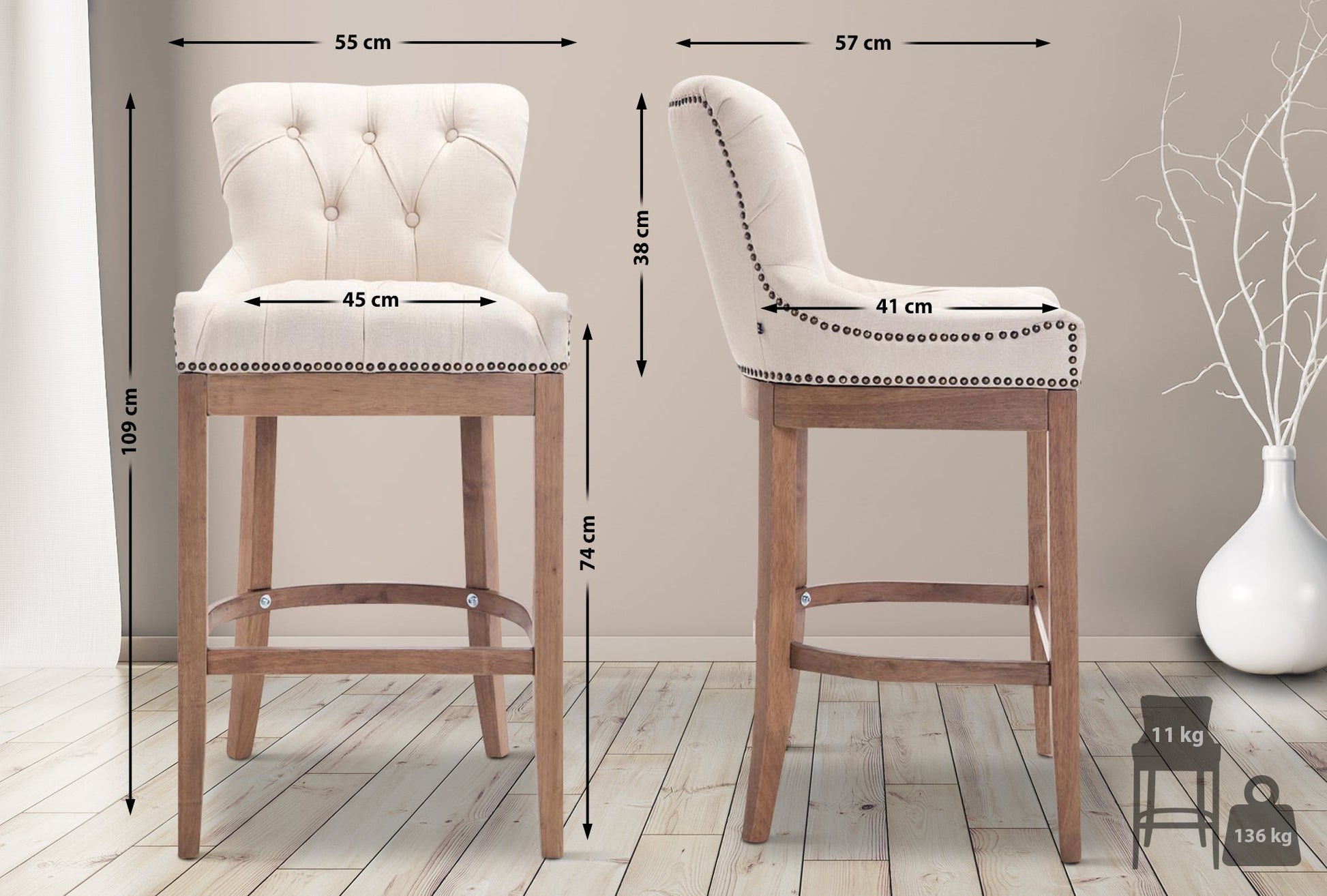 The frame is made of rubberwood, which, due to its high hardness, is ideal for furniture making. Floor protectors are included to prevent damage to delicate floors.